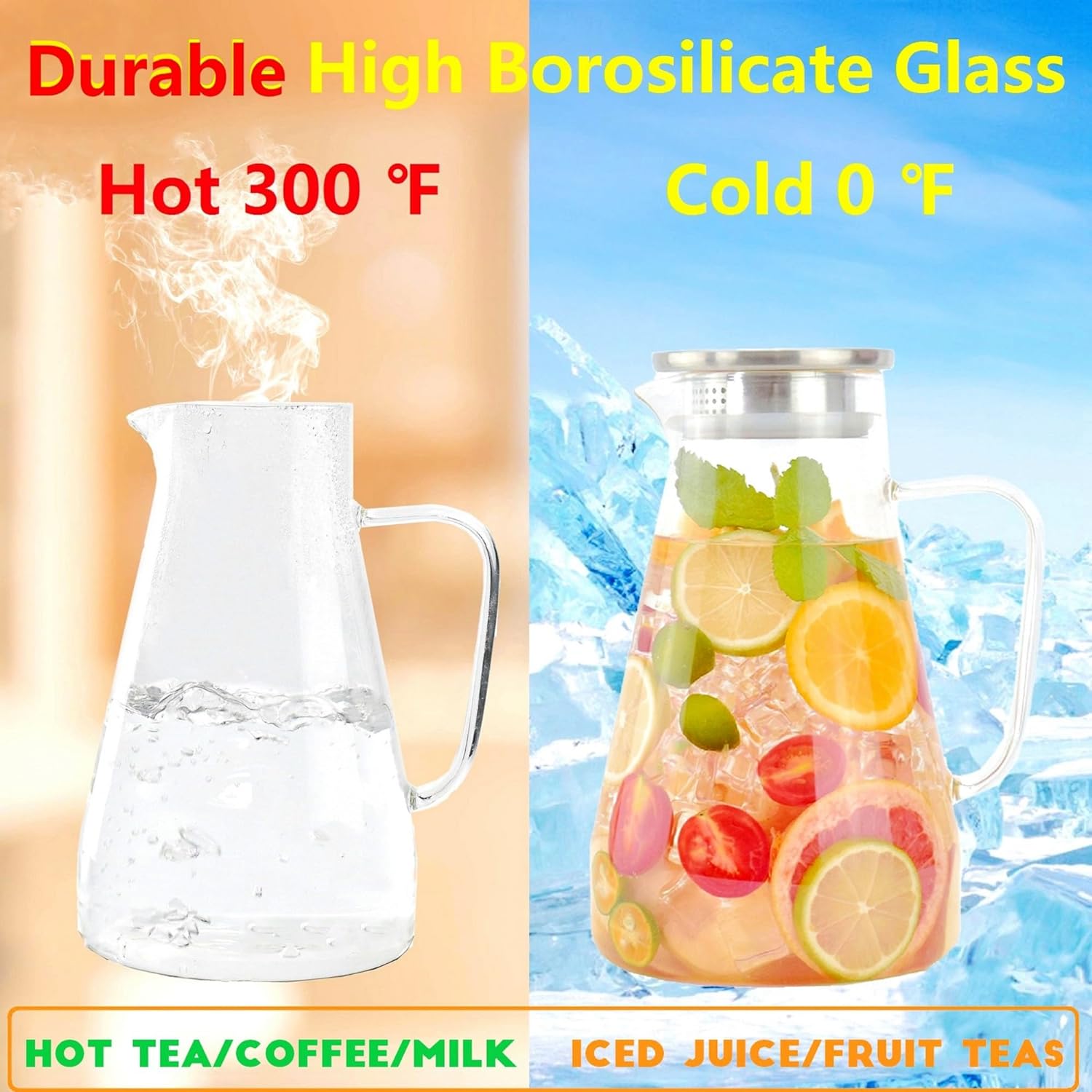 Jarra de vidro de 2 litros e 68 onças com tampa, jarra de água quente e fria com alça, para bebidas caseiras, sucos, chá gelado e leite transparente