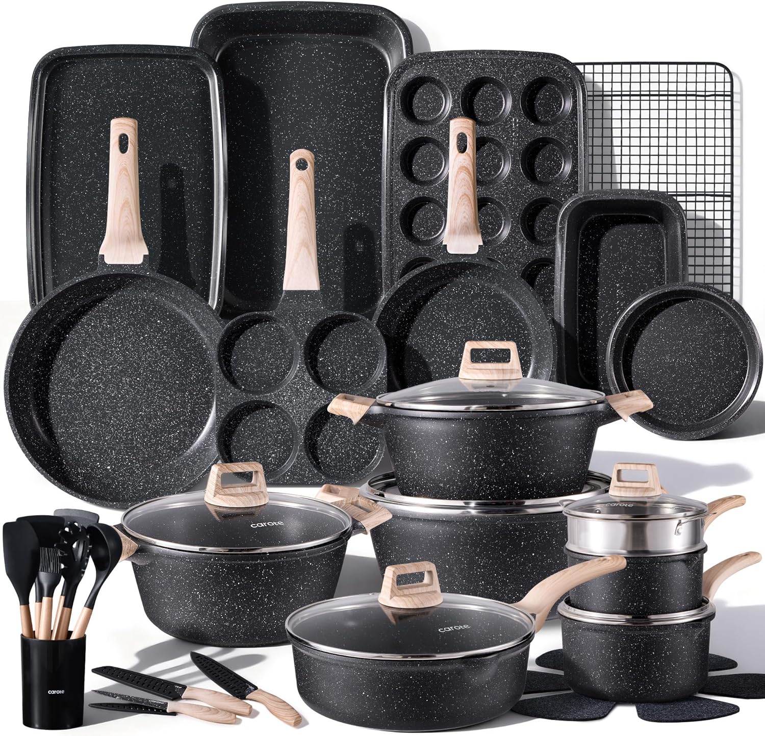 SISXSO 21Pcs Pots and Pans Set, Nonstick Cookware Sets, White Granite Induction Cookware Non Stick Cooking Set w/Frying Pans & Saucepans(PFOS, PFOA Free)