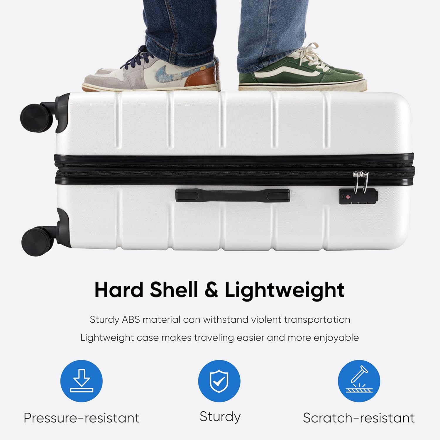 Durable & Scratch-Resistant: Made from high-quality ABS hard shell, this suitcase is impact-resistant, lightweight, and built to withstand travel wear and tear. The reinforced aluminum telescopic handle is sturdy and resistant to bending, ensuring long-lasting durability.