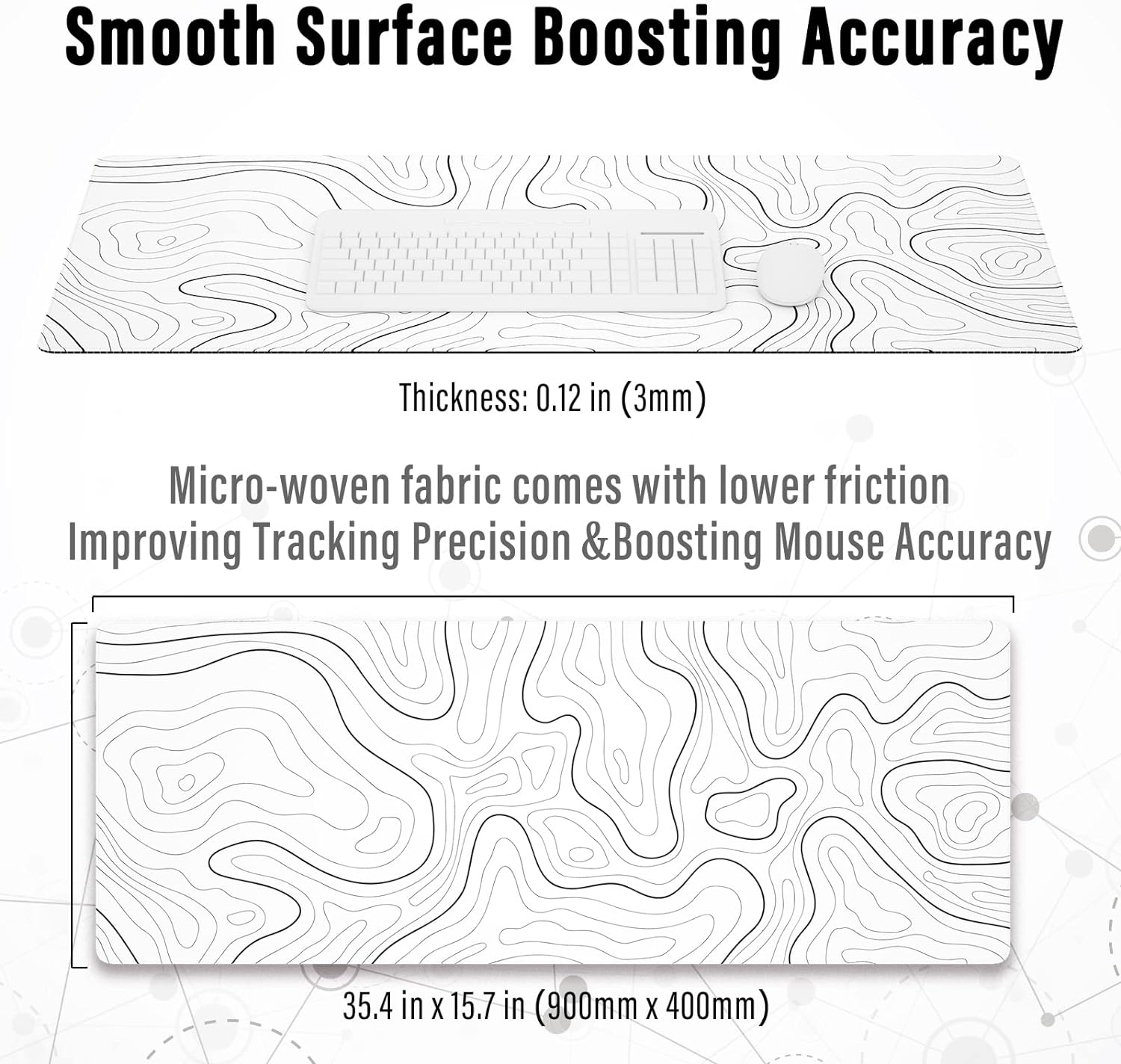 Mouse pad grande para jogos com bordas costuradas, tapete de mesa minimalista com mapa topográfico, mousepad XL estendido com base antiderrapante, tapete de mesa legal para teclado e mouse, 35,4 x 15,7 pol., branco