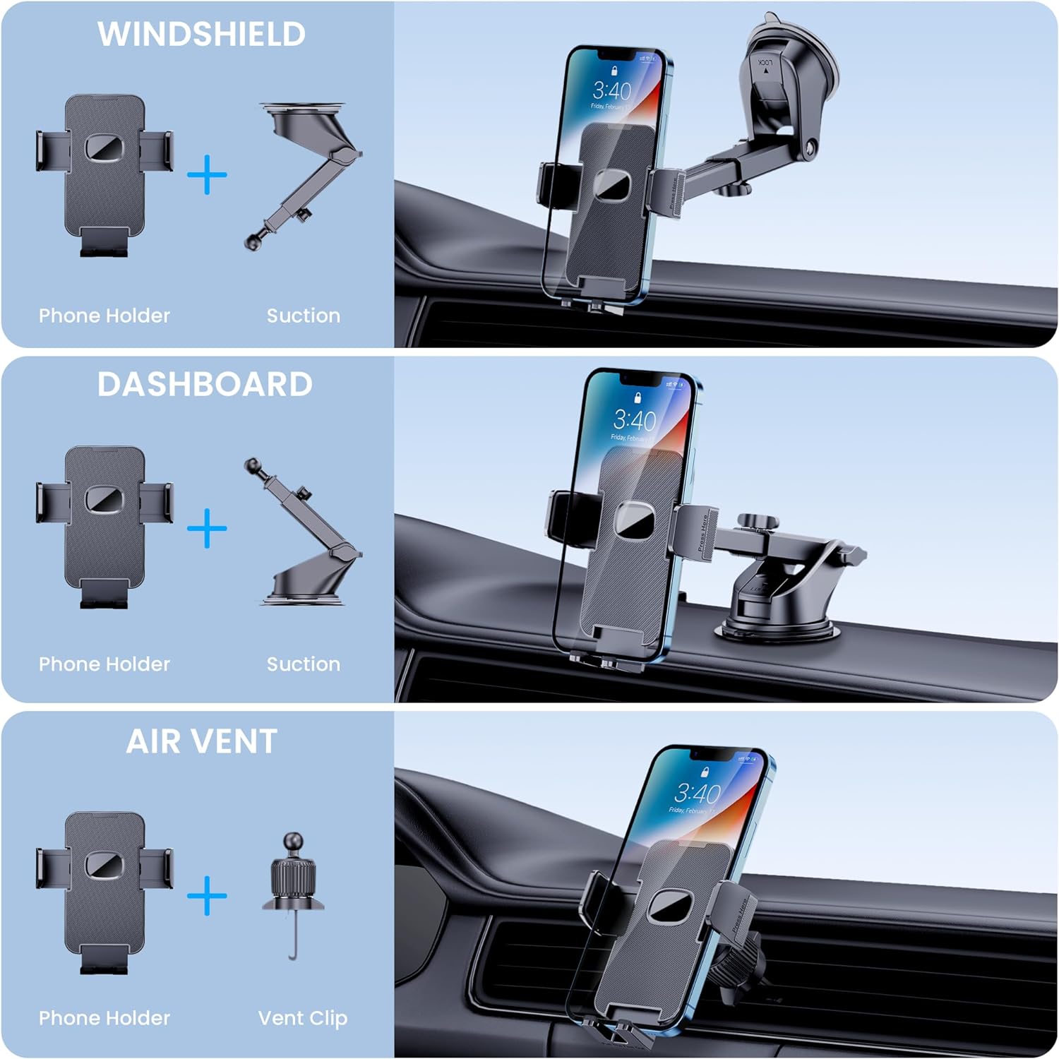 Suporte de telefone para carro para iPhone [Sucção poderosa] Suporte de telefone para painel de carro, para-brisa, ventilação de ar, acessórios universais [Capas grossas amigáveis] Suporte de telefone celular para automóvel, adequado para smartphone