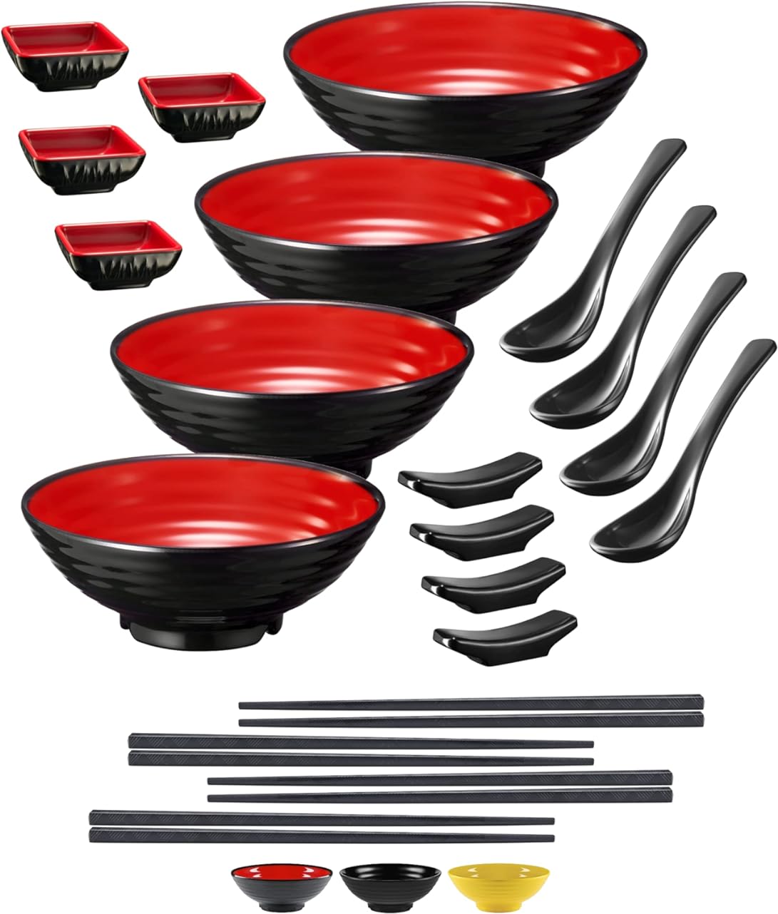 SISXSO Unbreakable Ramen Bowl Set with Chopsticks and Spoon: 2 large Japanese Style Melamine Ramen Bowls, Dipping Bowls and Chopstick Stands for Asian Pho Soup Thai Miso Udon Wonton (2 Bowl Set, Red-Black)
